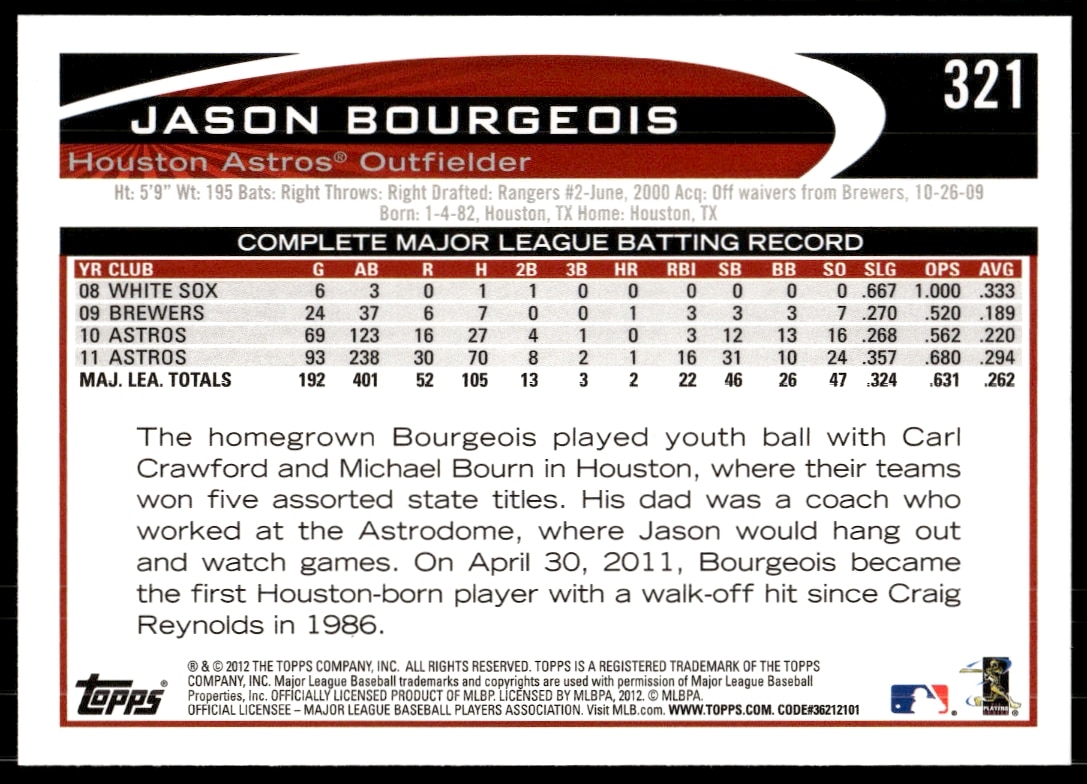 This Baseball card, from 2012 is part of the Topps card set. Jason Bourgeois is featured and has a card number of 321.
