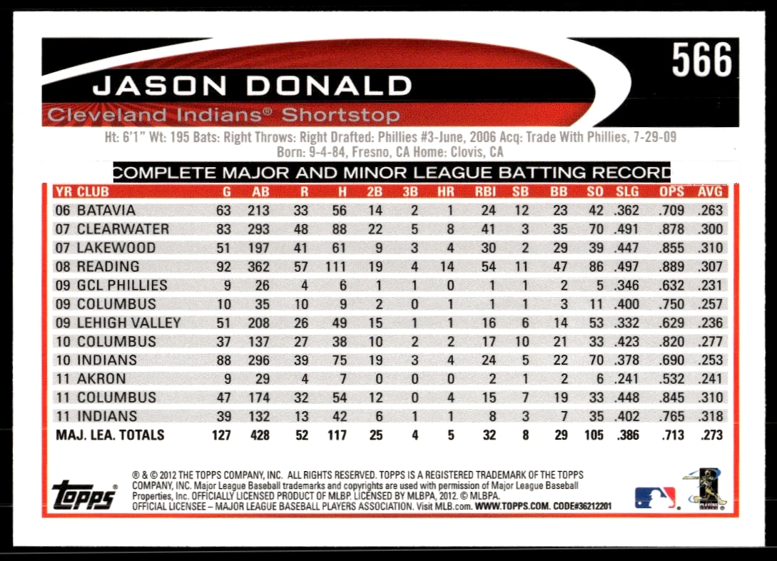 This Baseball card, from 2012 is part of the Topps card set. Jason Donald is featured and has a card number of 566.