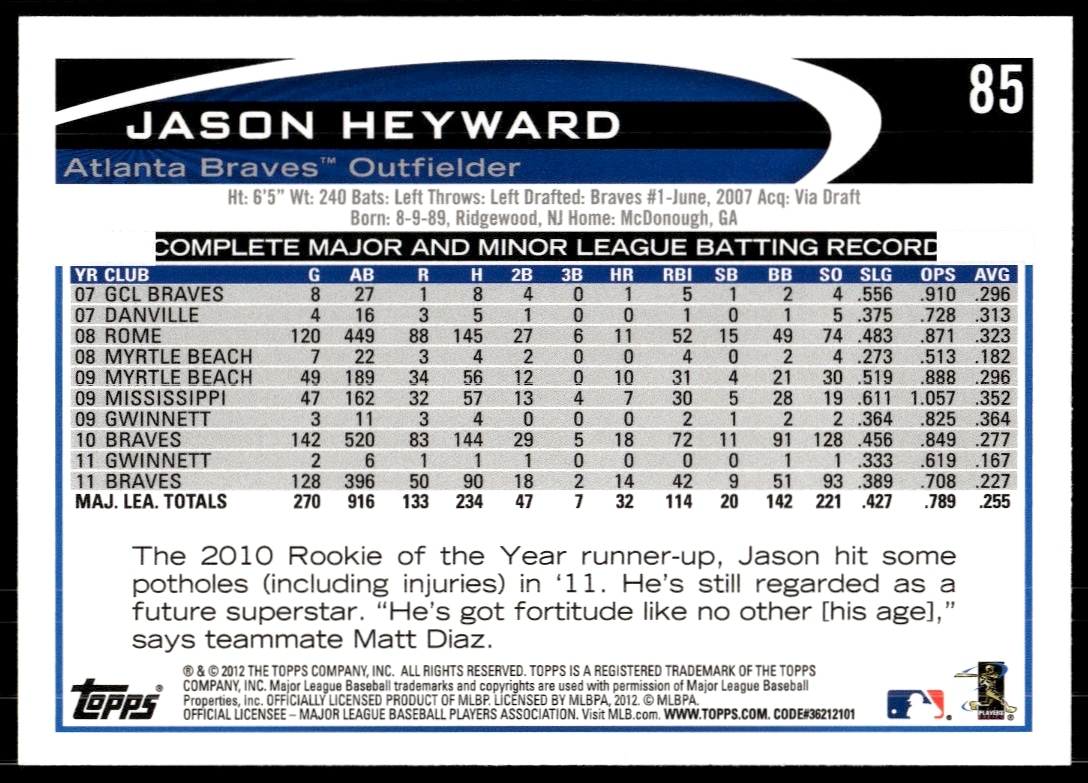 This Baseball card, from 2012 is part of the Topps card set. Jason Heyward is featured and has a card number of 85.