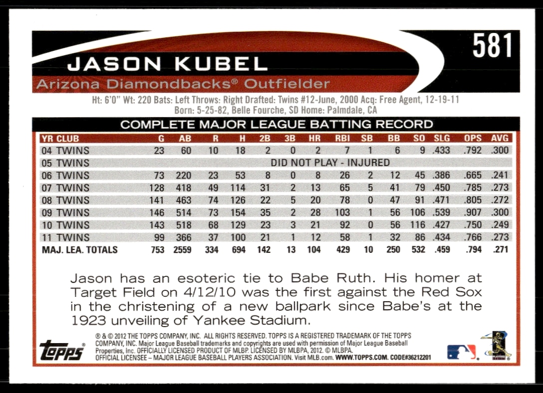 This Baseball card, from 2012 is part of the Topps card set. Jason Kubel is featured and has a card number of 581.