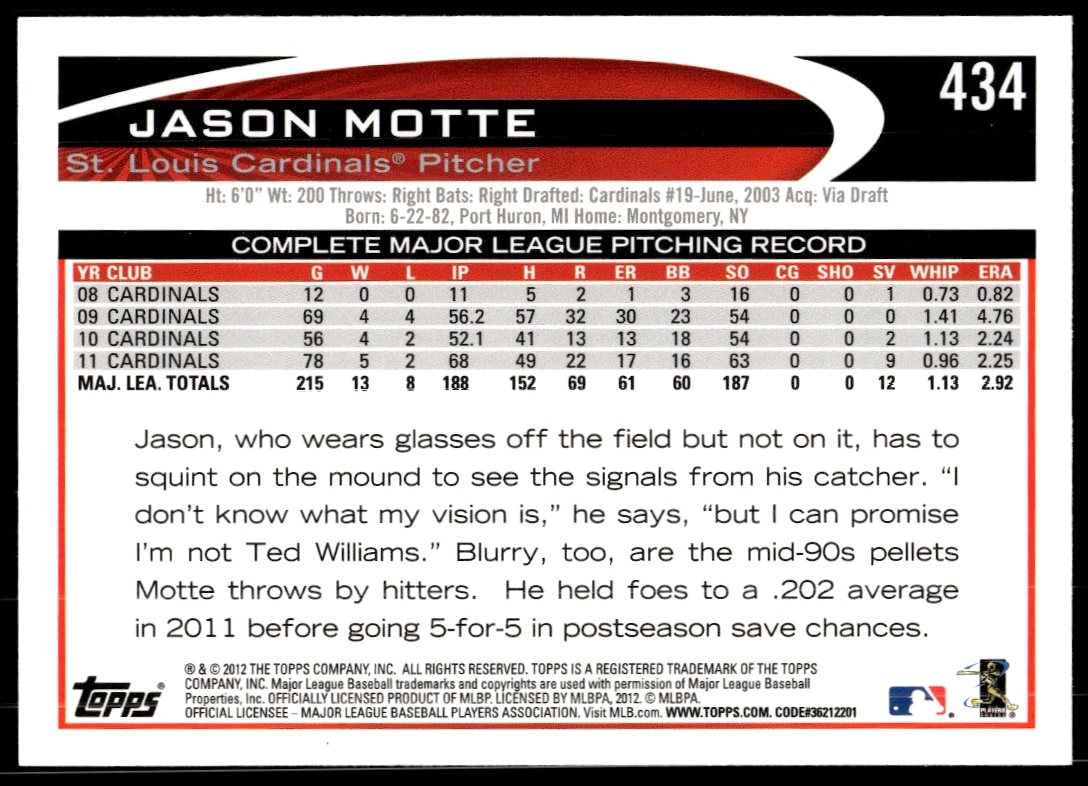 This Baseball card, from 2012 is part of the Topps card set. Jason Motte is featured and has a card number of 434.