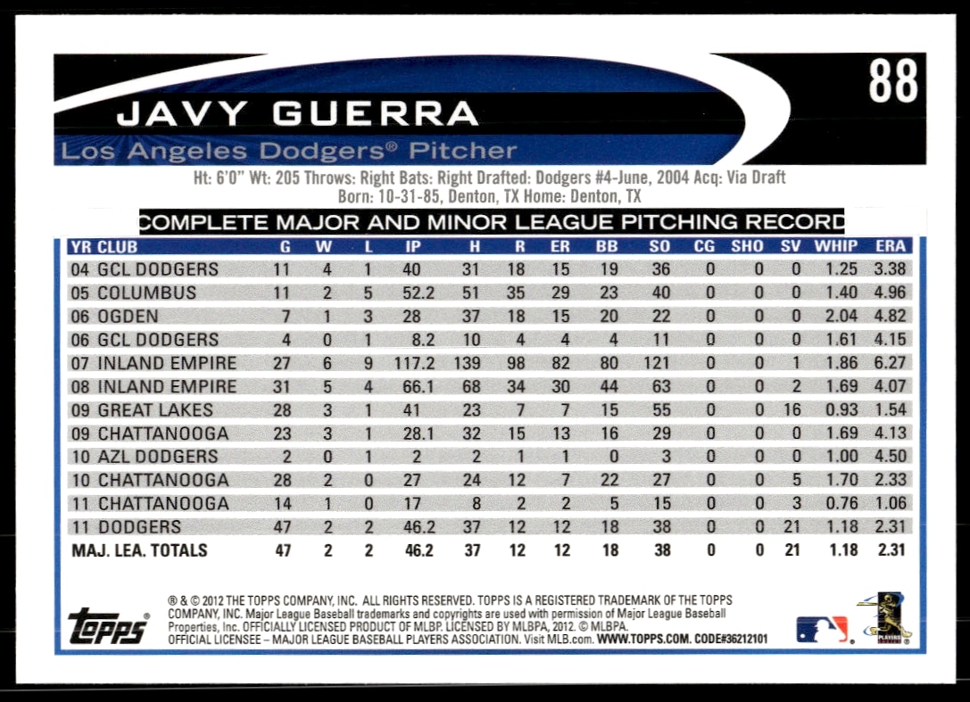This Baseball card, from 2012 is part of the Topps card set. Javy Guerra is featured and has a card number of 88.