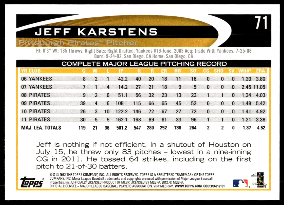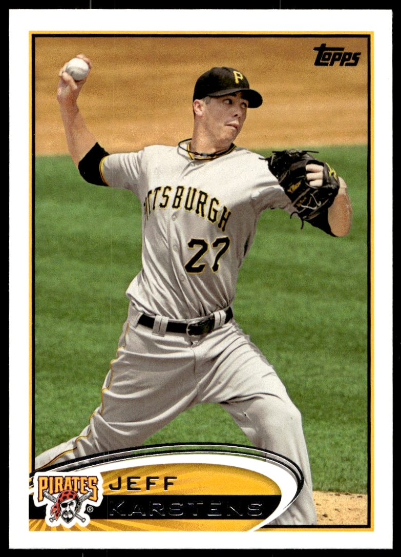 This Baseball card, from 2012 is part of the Topps card set. Jeff Karstens is featured and has a card number of 71.