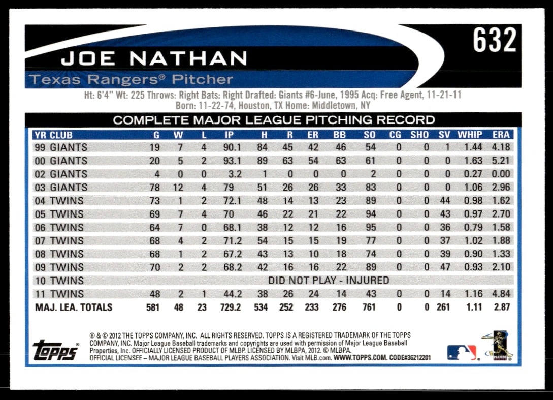 This Baseball card, from 2012 is part of the Topps card set. Joe Nathan is featured and has a card number of 632.