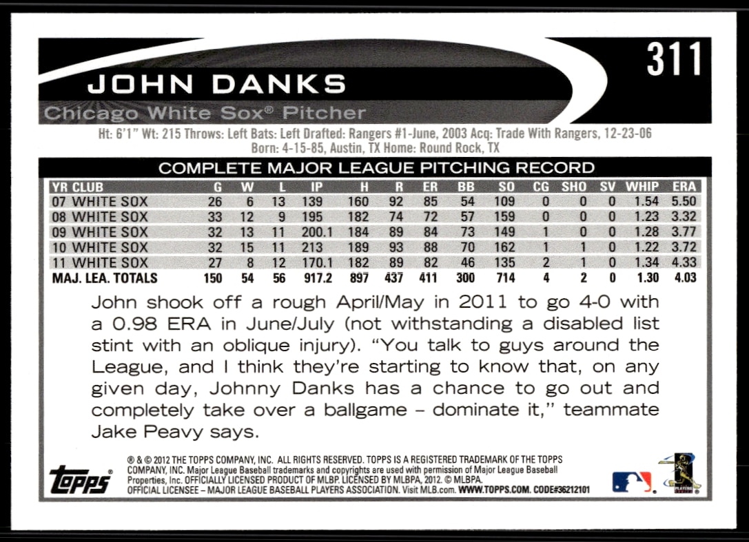 This Baseball card, from 2012 is part of the Topps card set. John Danks is featured and has a card number of 311.