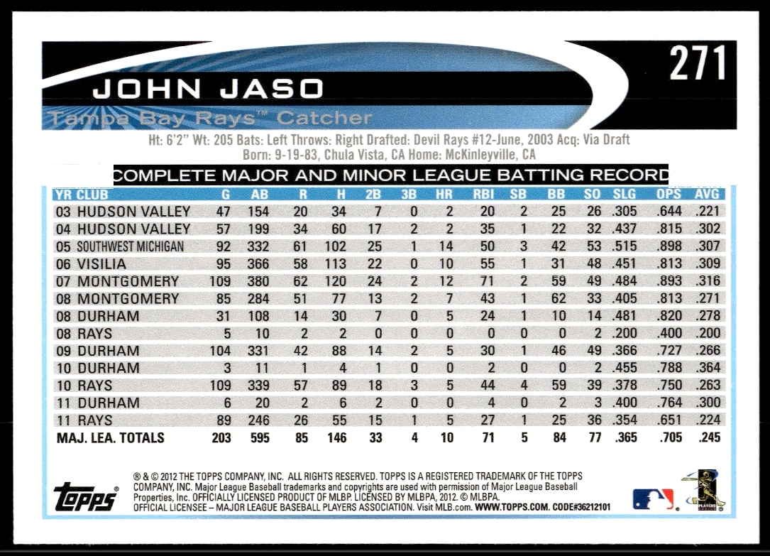 This Baseball card, from 2012 is part of the Topps card set. John Jaso is featured and has a card number of 271.