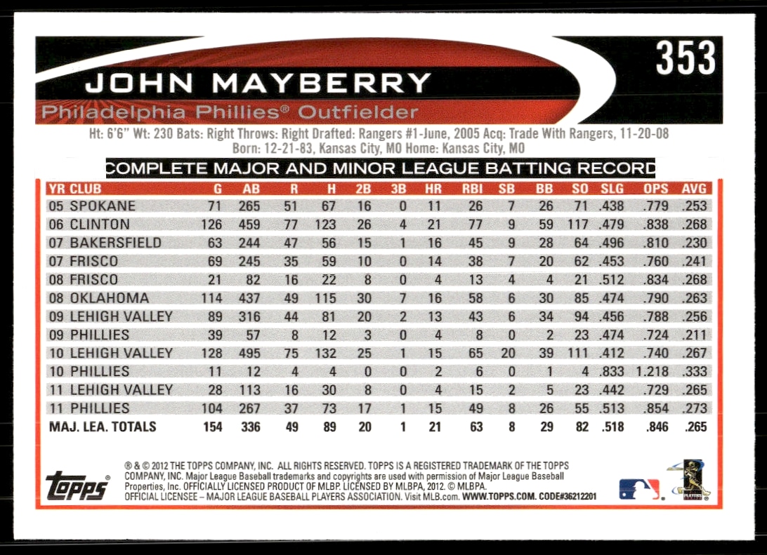 This Baseball card, from 2012 is part of the Topps card set. John Mayberry Jr. is featured and has a card number of 353.
