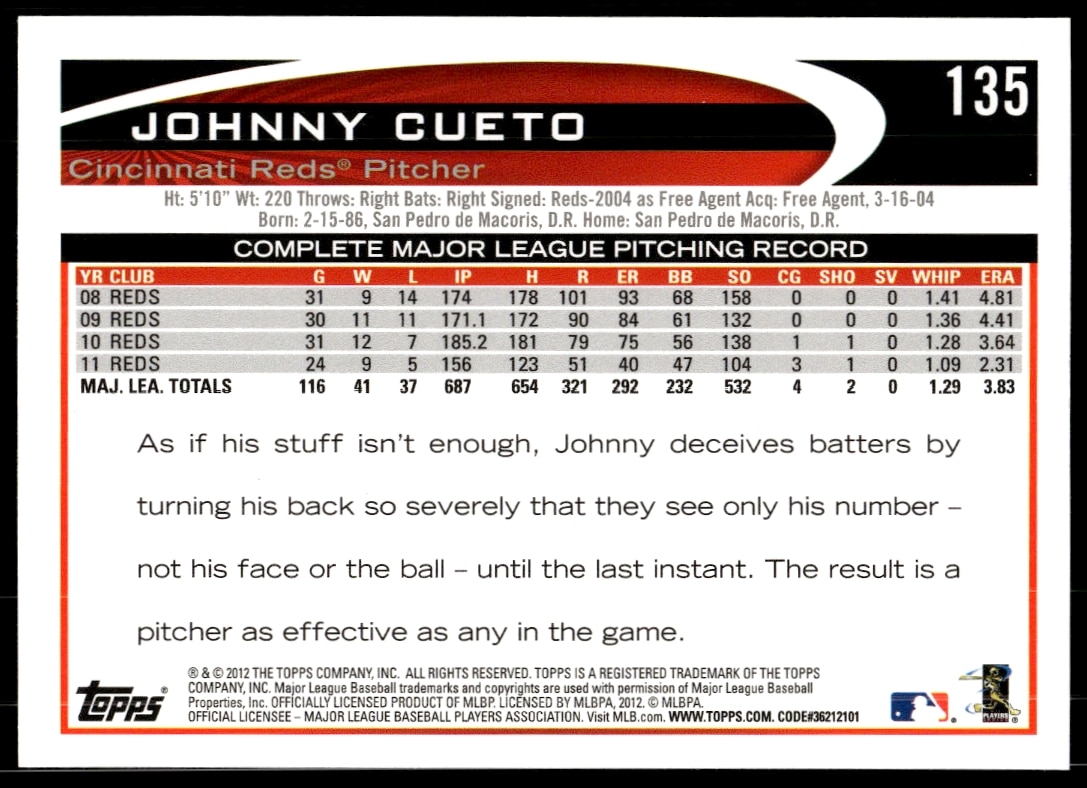 This Baseball card, from 2012 is part of the Topps card set. Johnny Cueto is featured and has a card number of 135.