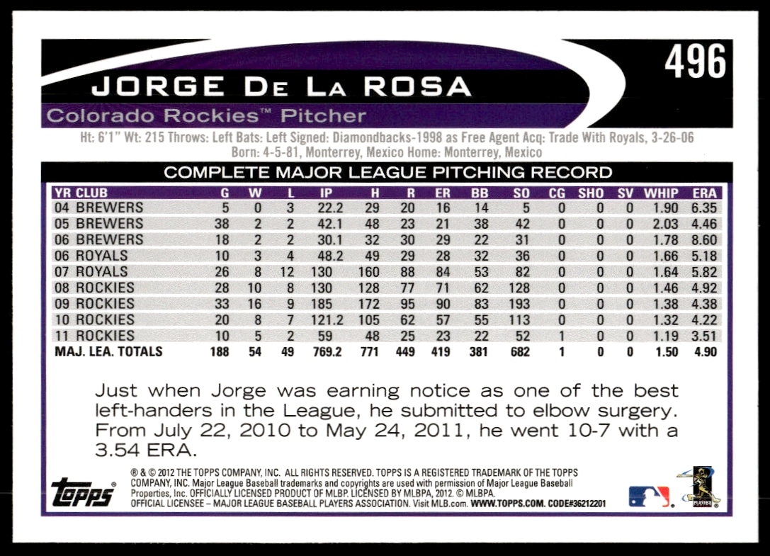 This Baseball card, from 2012 is part of the Topps card set. Jorge De La Rosa is featured and has a card number of 496.