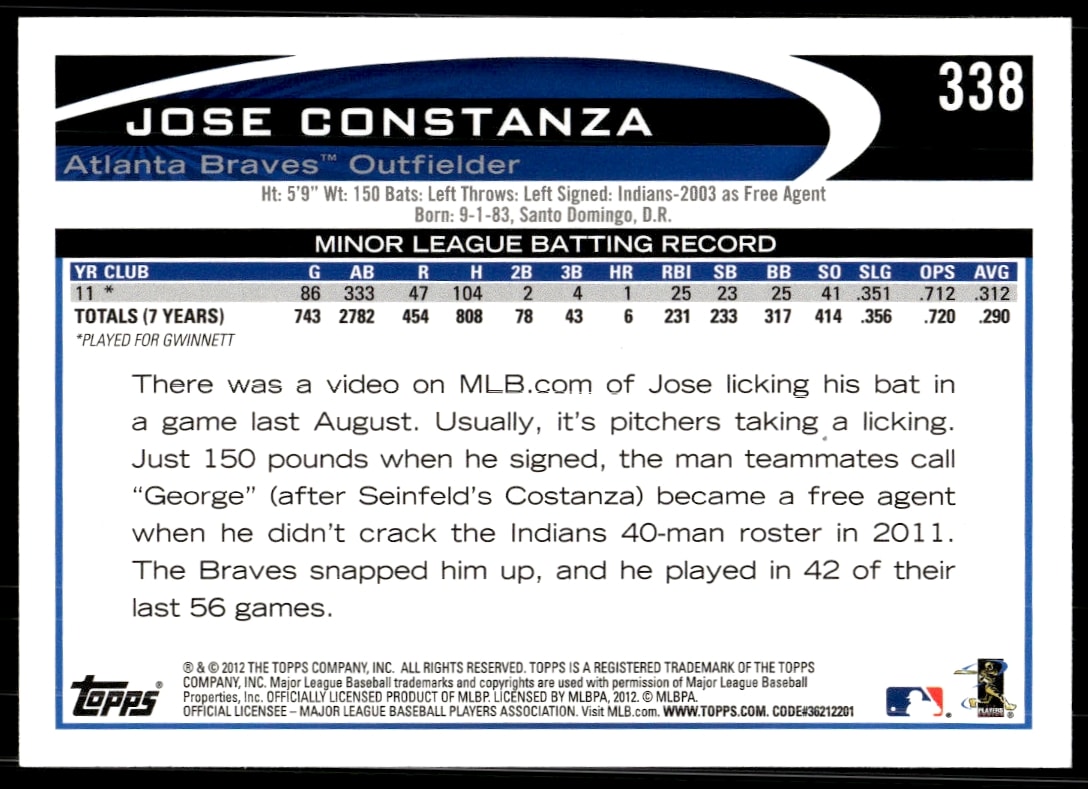 This Baseball card, from 2012 is part of the Topps card set. Jose Constanza is featured and has a card number of 338.