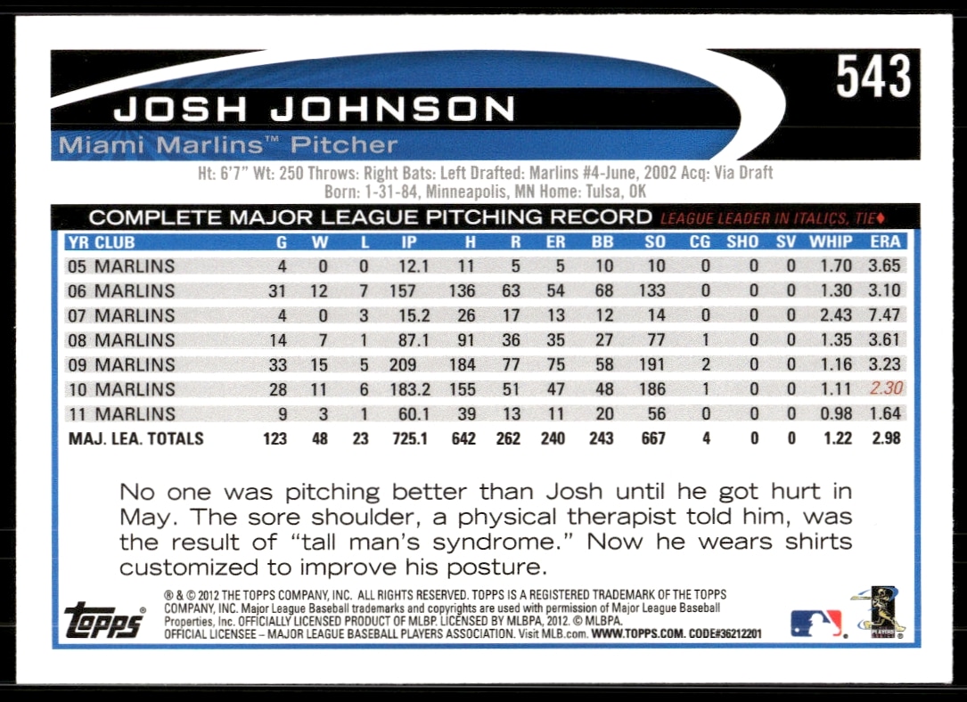 This Baseball card, from 2012 is part of the Topps card set. Josh Johnson is featured and has a card number of 543.