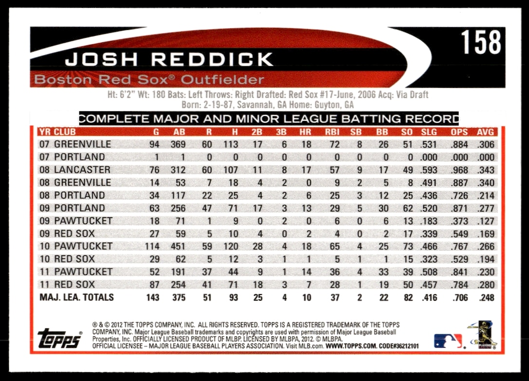 This Baseball card, from 2012 is part of the Topps card set. Josh Reddick is featured and has a card number of 158.