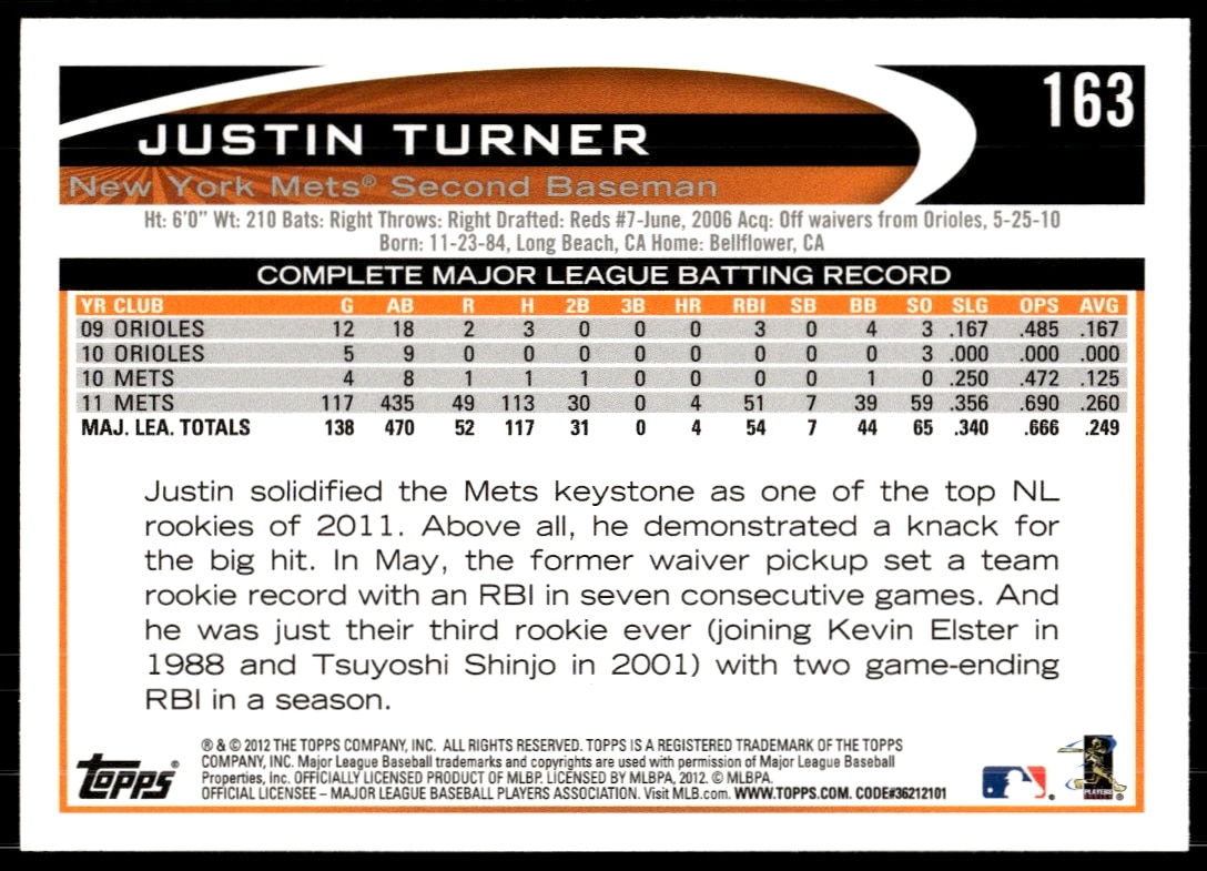 This Baseball card, from 2012 is part of the Topps card set. Justin Turner is featured and has a card number of 163.