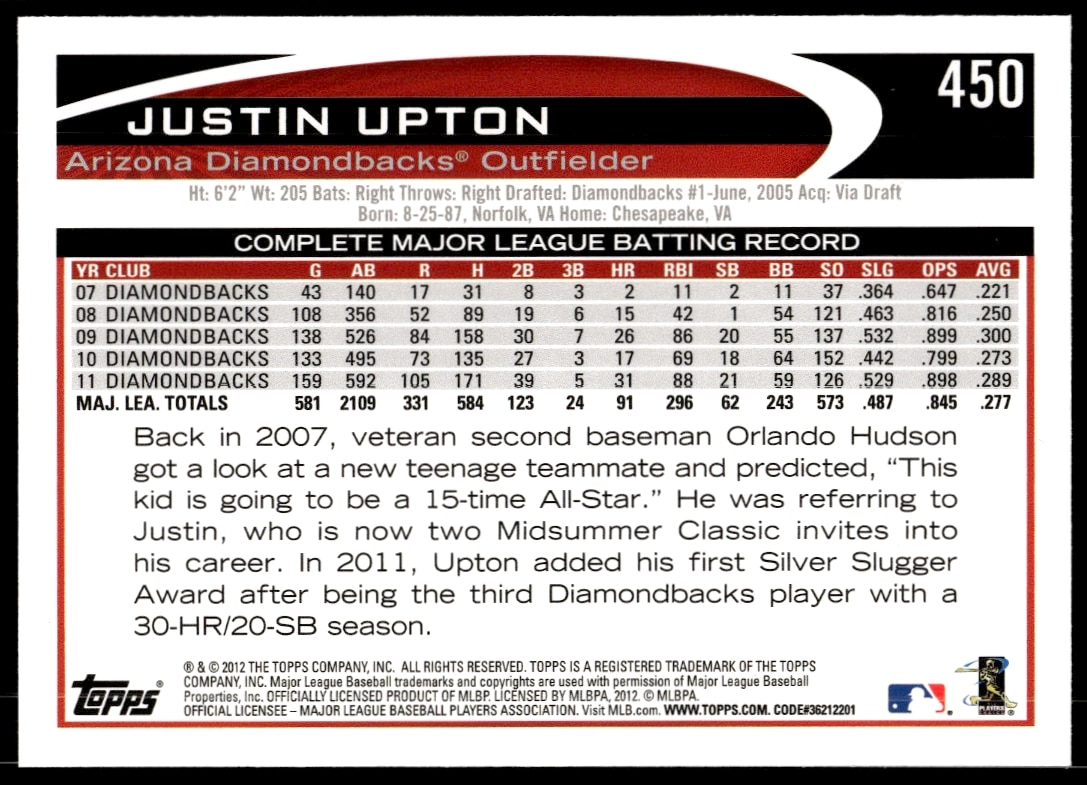 This Baseball card, from 2012 is part of the Topps card set. Justin Upton is featured and has a card number of 450.
