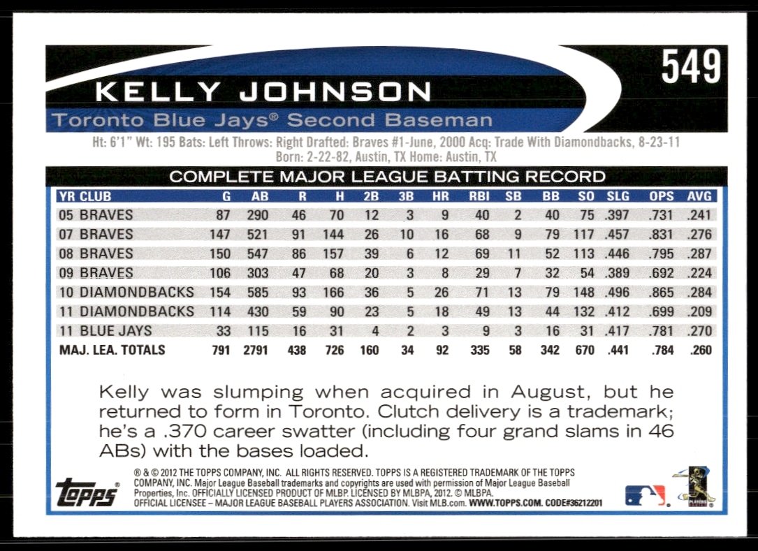 This Baseball card, from 2012 is part of the Topps card set. Kelly Johnson is featured and has a card number of 549.