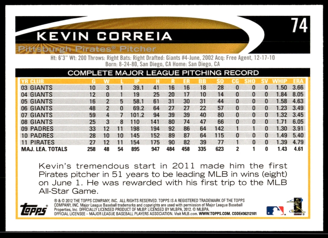 This Baseball card, from 2012 is part of the Topps card set. Kevin Correia is featured and has a card number of 74.