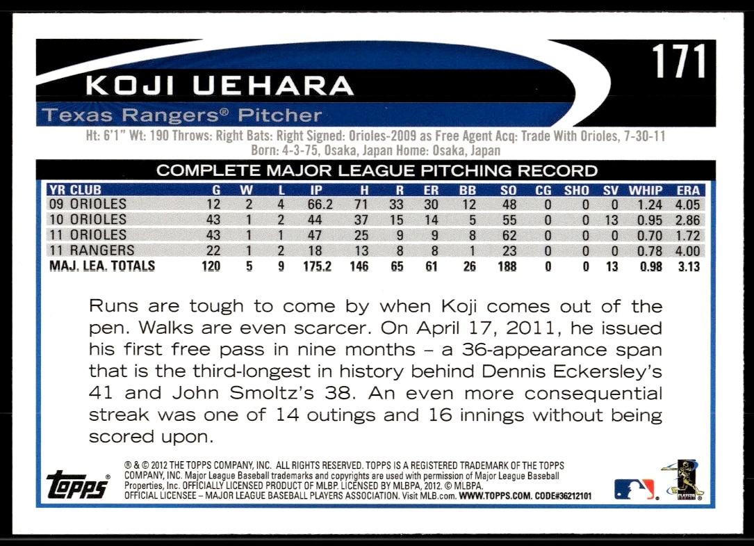 This Baseball card, from 2012 is part of the Topps card set. Koji Uehara is featured and has a card number of 171.