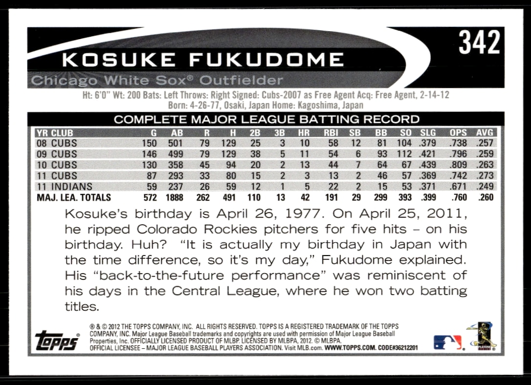 This Baseball card, from 2012 is part of the Topps card set. Kosuke Fukudome is featured and has a card number of 342.