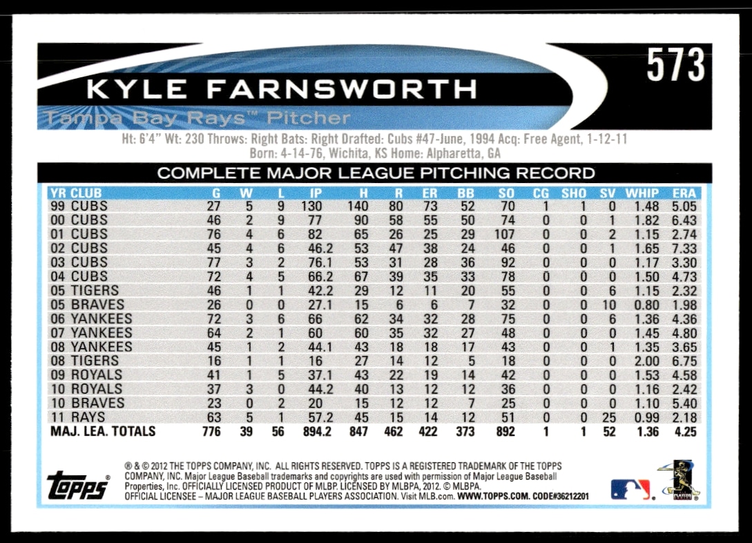This Baseball card, from 2012 is part of the Topps card set. Kyle Farnsworth is featured and has a card number of 573.