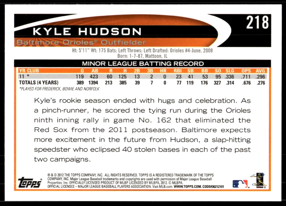 This Baseball card, from 2012 is part of the Topps card set. Kyle Hudson is featured and has a card number of 218.