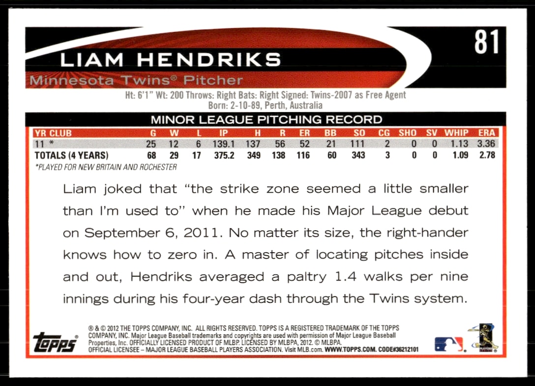 This Baseball card, from 2012 is part of the Topps card set. Liam Hendriks is featured and has a card number of 81.