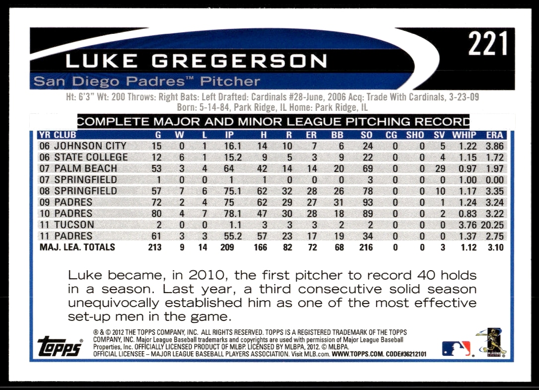 This Baseball card, from 2012 is part of the Topps card set. Luke Gregerson is featured and has a card number of 221.