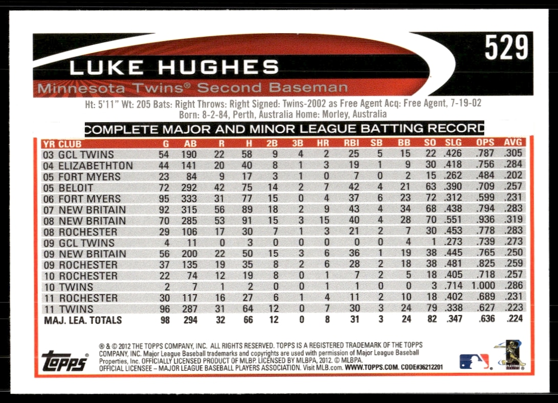 This Baseball card, from 2012 is part of the Topps card set. Luke Hughes is featured and has a card number of 529.