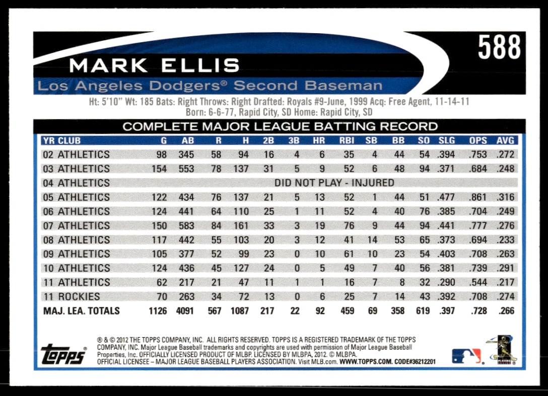 This Baseball card, from 2012 is part of the Topps card set. Mark Ellis is featured and has a card number of 588.