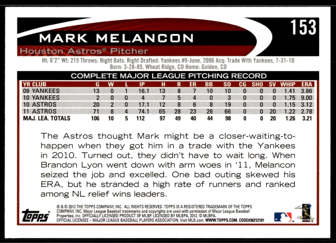 This Baseball card, from 2012 is part of the Topps card set. Mark Melancon is featured and has a card number of 153.