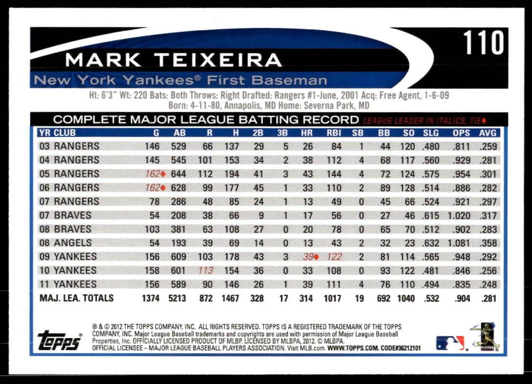 This Baseball card, from 2012 is part of the Topps card set. Mark Teixeira is featured and has a card number of 110.
