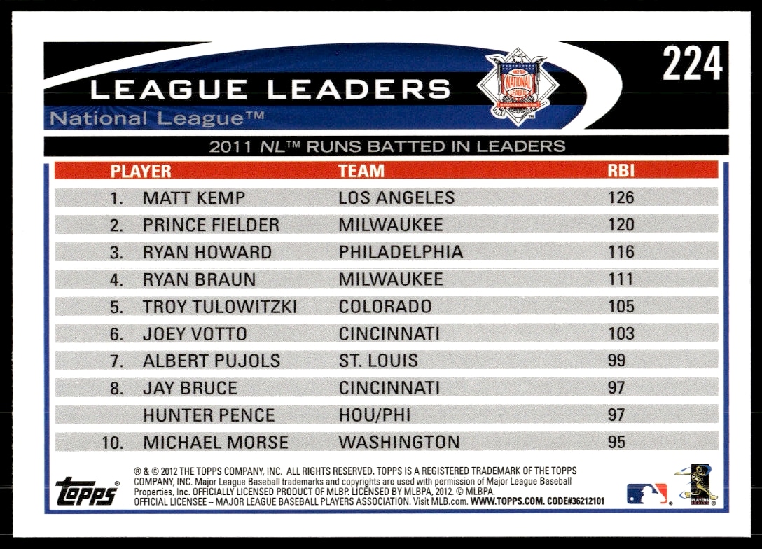 This Baseball card, from 2012 is part of the Topps card set. Matt Kemp / Prince Fielder / Ryan Howard is featured and has a card number of 224.