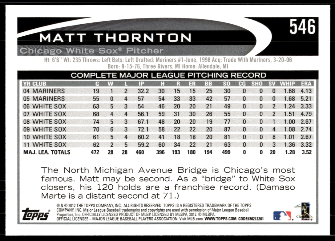 This Baseball card, from 2012 is part of the Topps card set. Matt Thornton is featured and has a card number of 546.