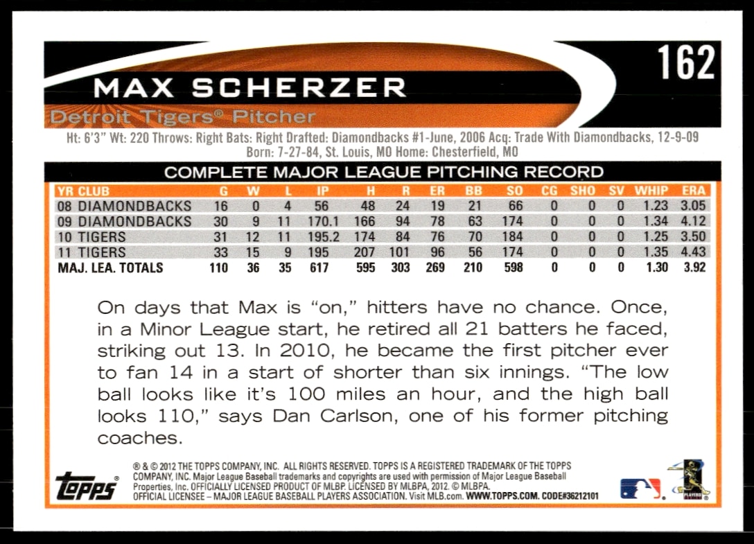 This Baseball card, from 2012 is part of the Topps card set. Max Scherzer is featured and has a card number of 162.
