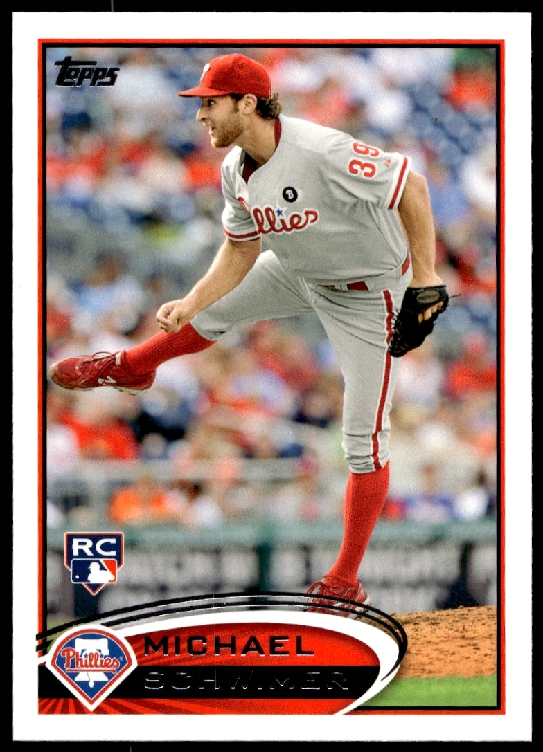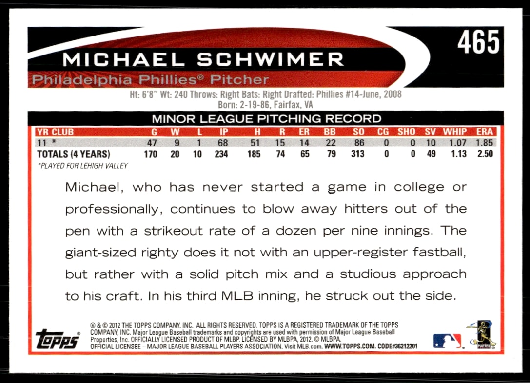 This Baseball card, from 2012 is part of the Topps card set. Michael Schwimer is featured and has a card number of 465.