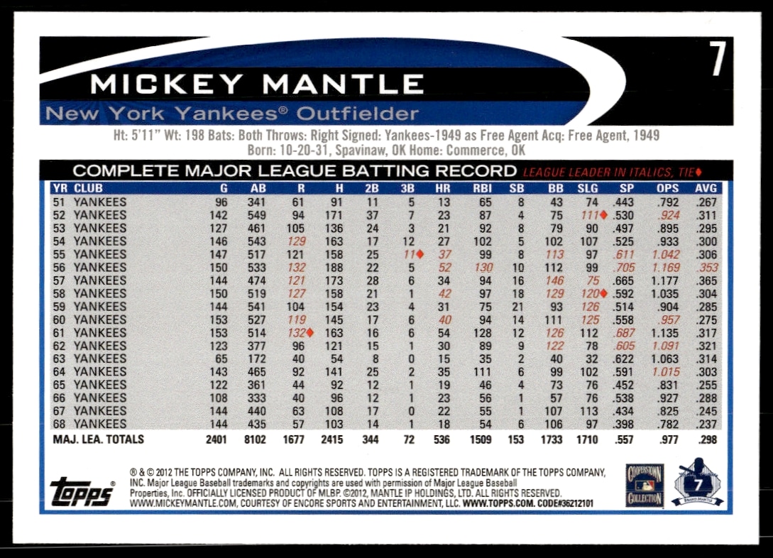 This Baseball card, from 2012 is part of the Topps card set. Mickey Mantle is featured and has a card number of 7.