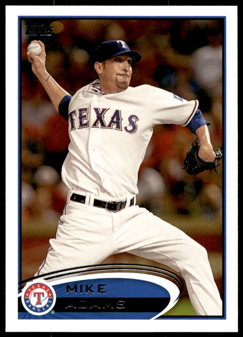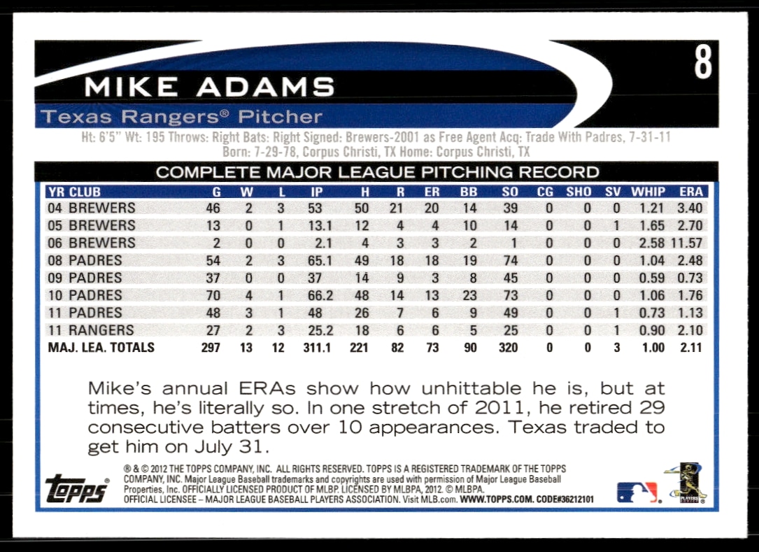 This Baseball card, from 2012 is part of the Topps card set. Mike Adams is featured and has a card number of 8.
