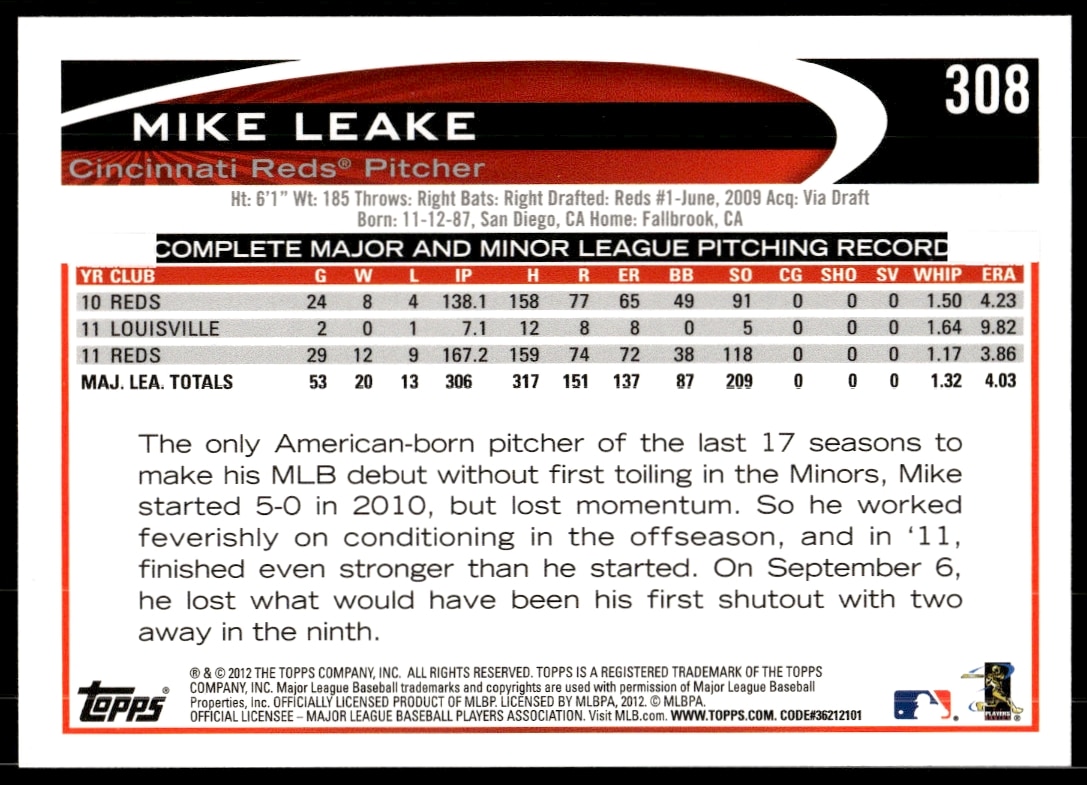 This Baseball card, from 2012 is part of the Topps card set. Mike Leake is featured and has a card number of 308.