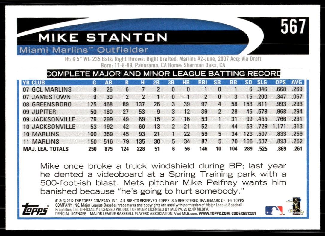 This Baseball card, from 2012 is part of the Topps card set. Mike Stanton is featured and has a card number of 567.