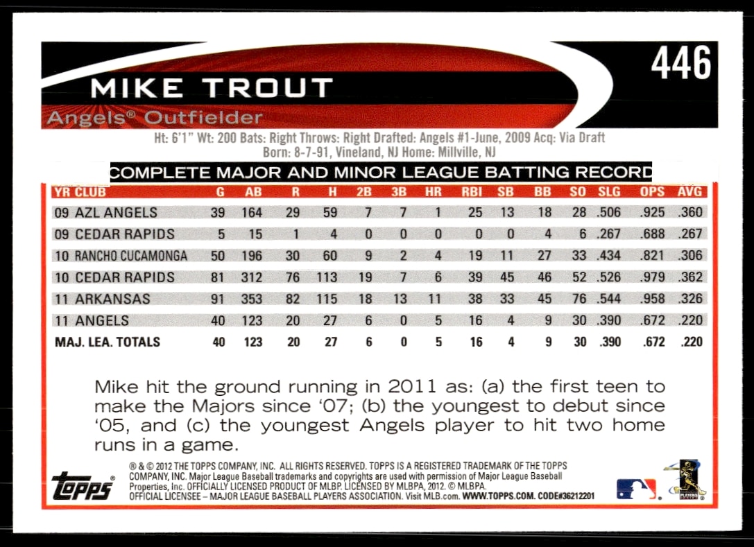 This Baseball card, from 2012 is part of the Topps card set. Mike Trout is featured and has a card number of 446.
