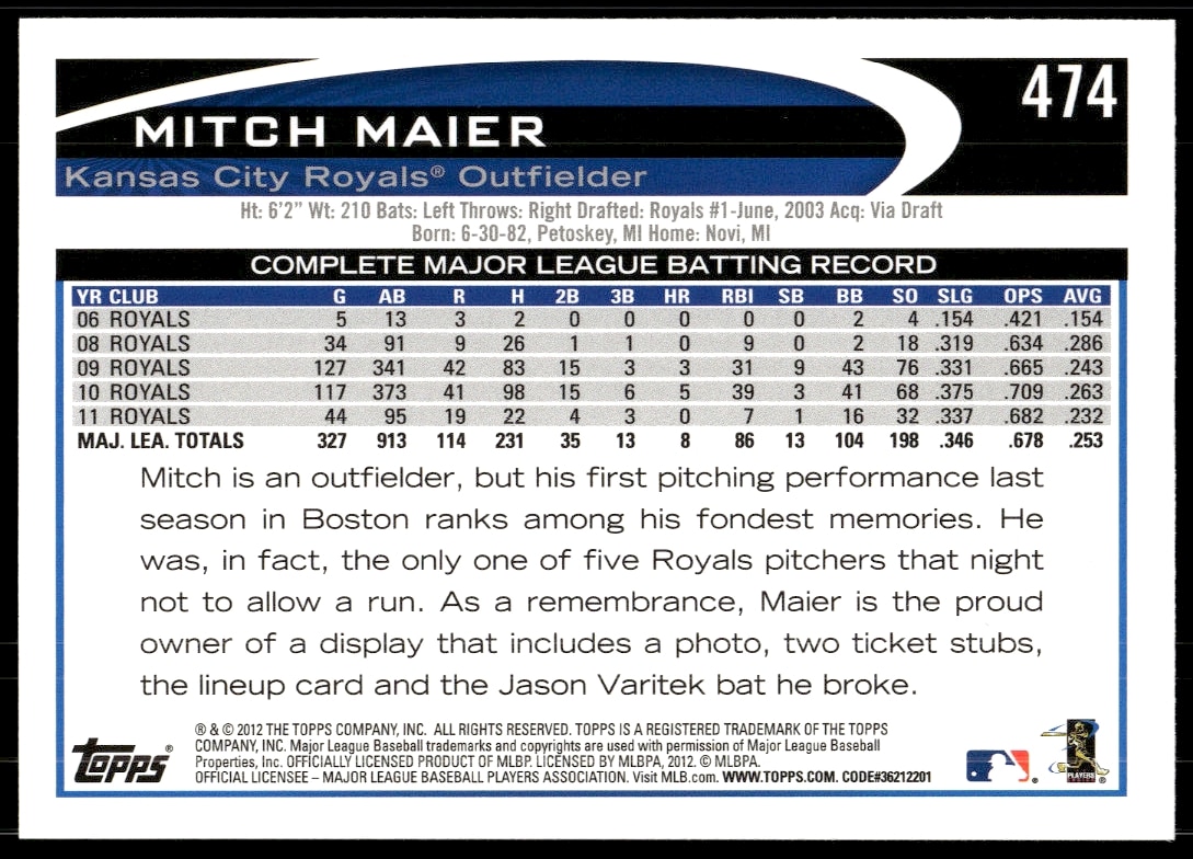 This Baseball card, from 2012 is part of the Topps card set. Mitch Maier is featured and has a card number of 474.