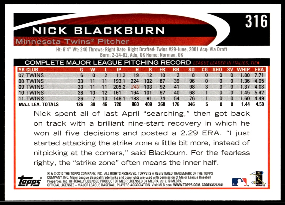 This Baseball card, from 2012 is part of the Topps card set. Nick Blackburn is featured and has a card number of 316.