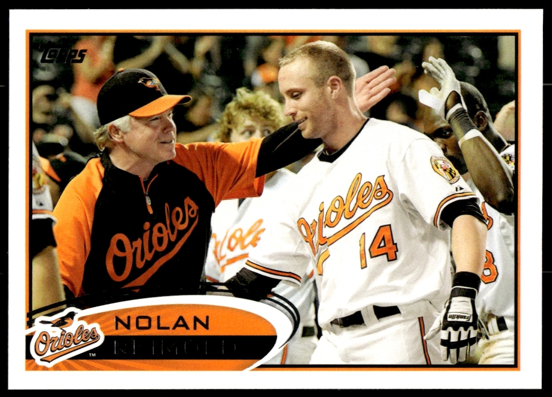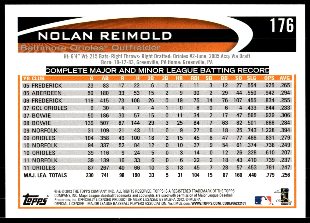 This Baseball card, from 2012 is part of the Topps card set. Nolan Reimold is featured and has a card number of 176.