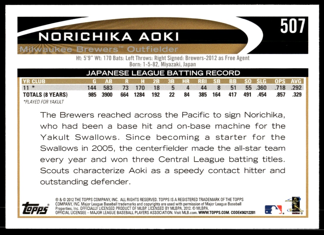 This Baseball card, from 2012 is part of the Topps card set. Norichika Aoki is featured and has a card number of 507.