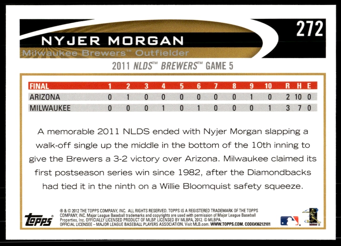 This Baseball card, from 2012 is part of the Topps card set. Nyjer Morgan is featured and has a card number of 272.