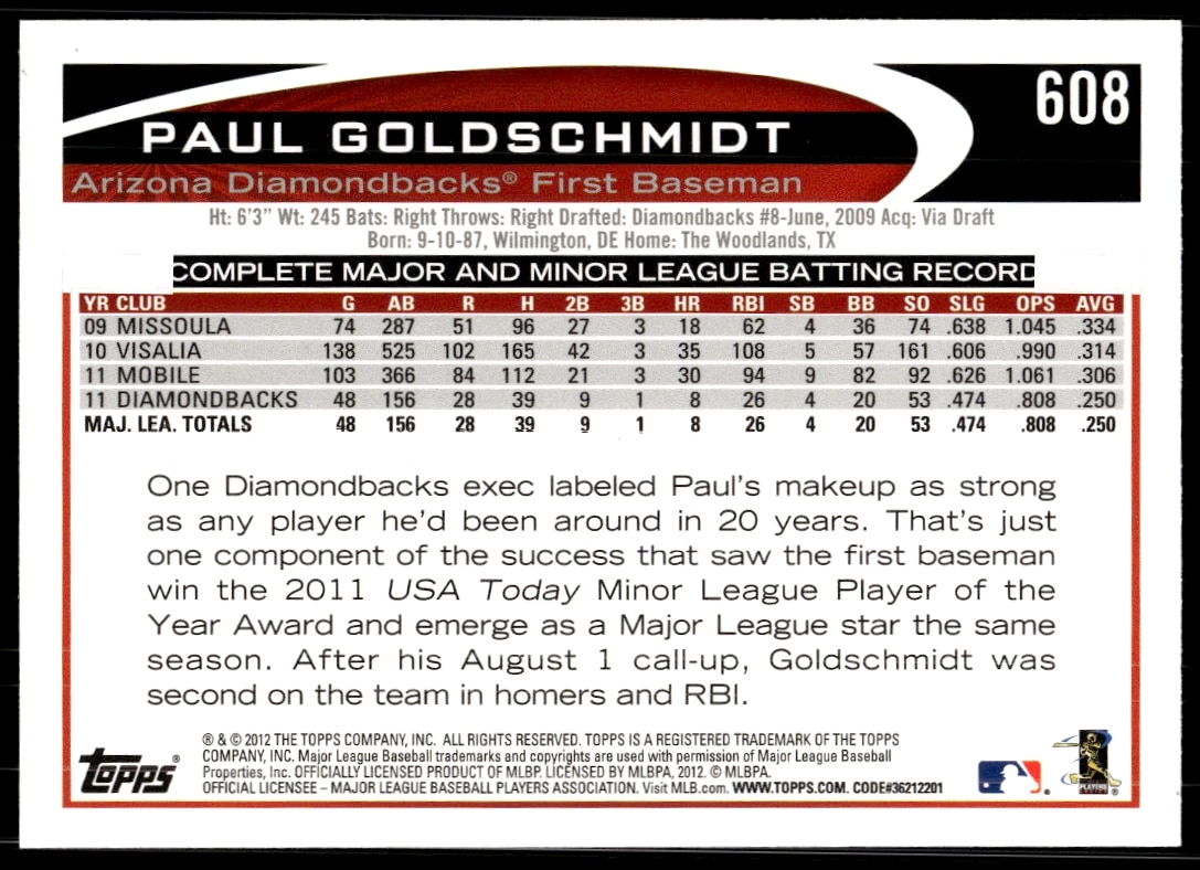 This Baseball card, from 2012 is part of the Topps card set. Paul Goldschmidt is featured and has a card number of 608.