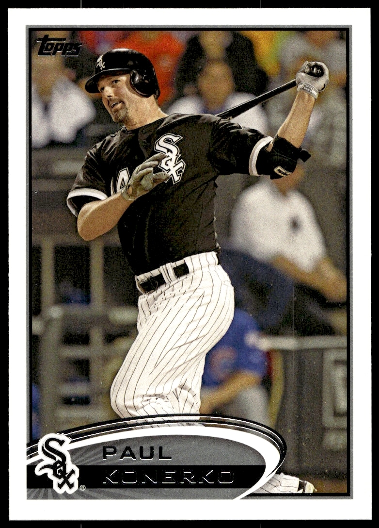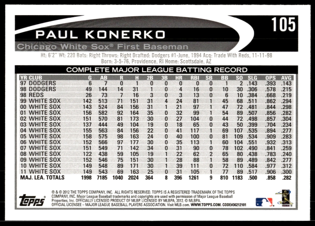This Baseball card, from 2012 is part of the Topps card set. Paul Konerko is featured and has a card number of 105.