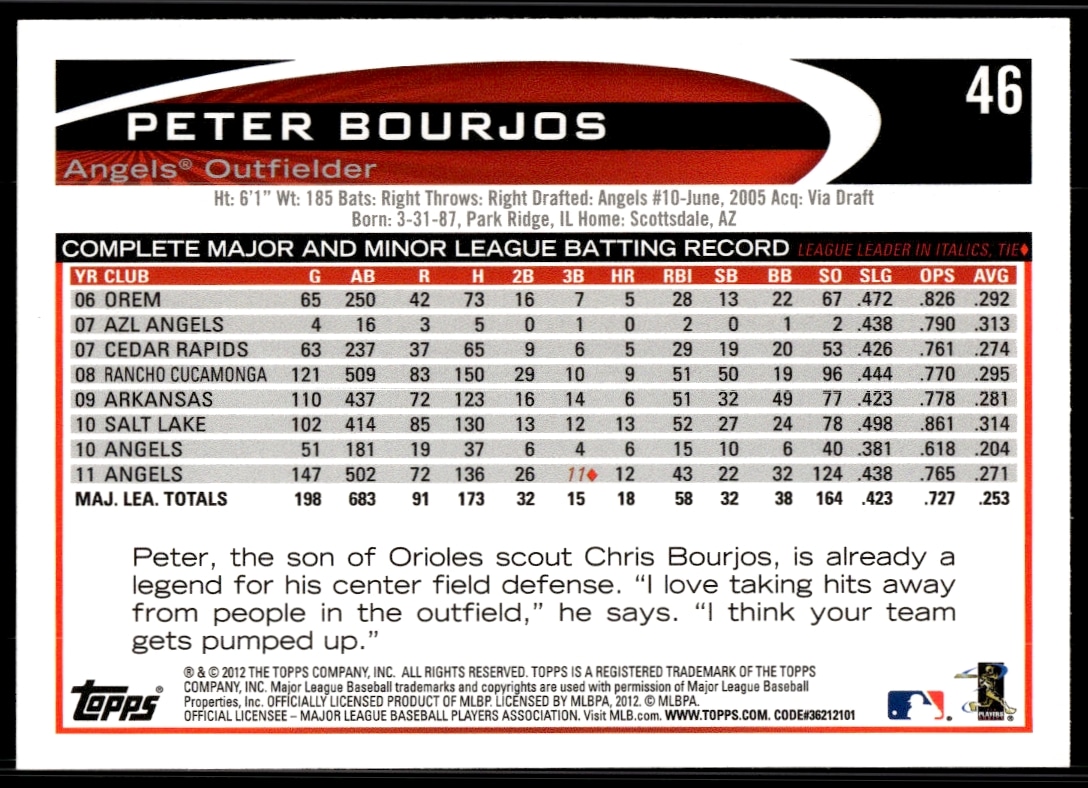 This Baseball card, from 2012 is part of the Topps card set. Peter Bourjos is featured and has a card number of 46.