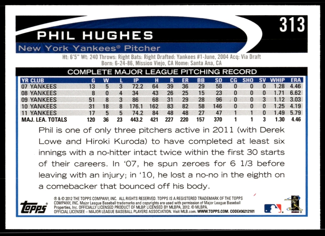 This Baseball card, from 2012 is part of the Topps card set. Phil Hughes is featured and has a card number of 313.