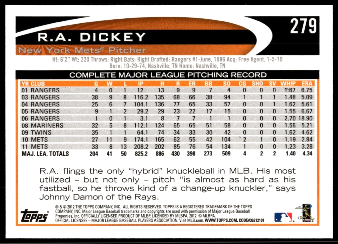 This Baseball card, from 2012 is part of the Topps card set. R.A. Dickey is featured and has a card number of 279.