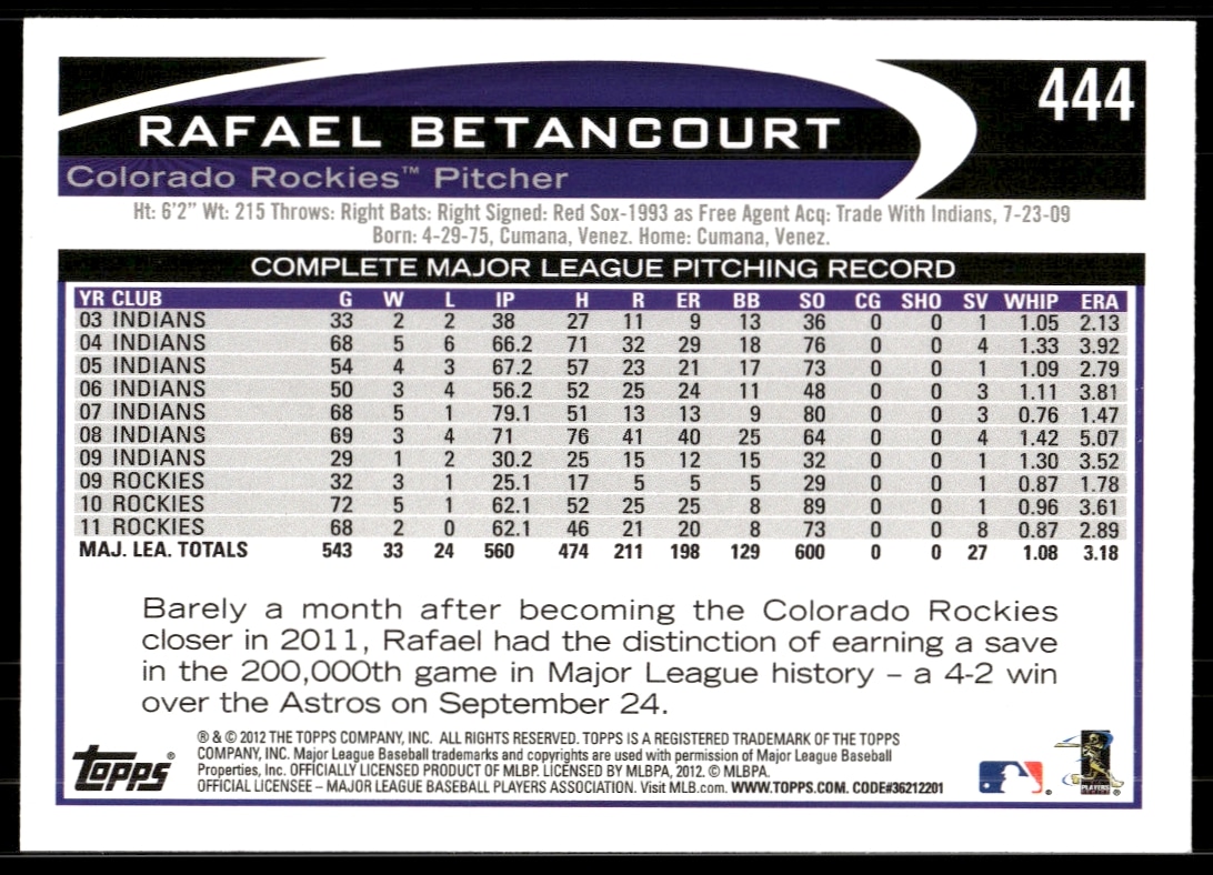 This Baseball card, from 2012 is part of the Topps card set. Rafael Betancourt is featured and has a card number of 444.